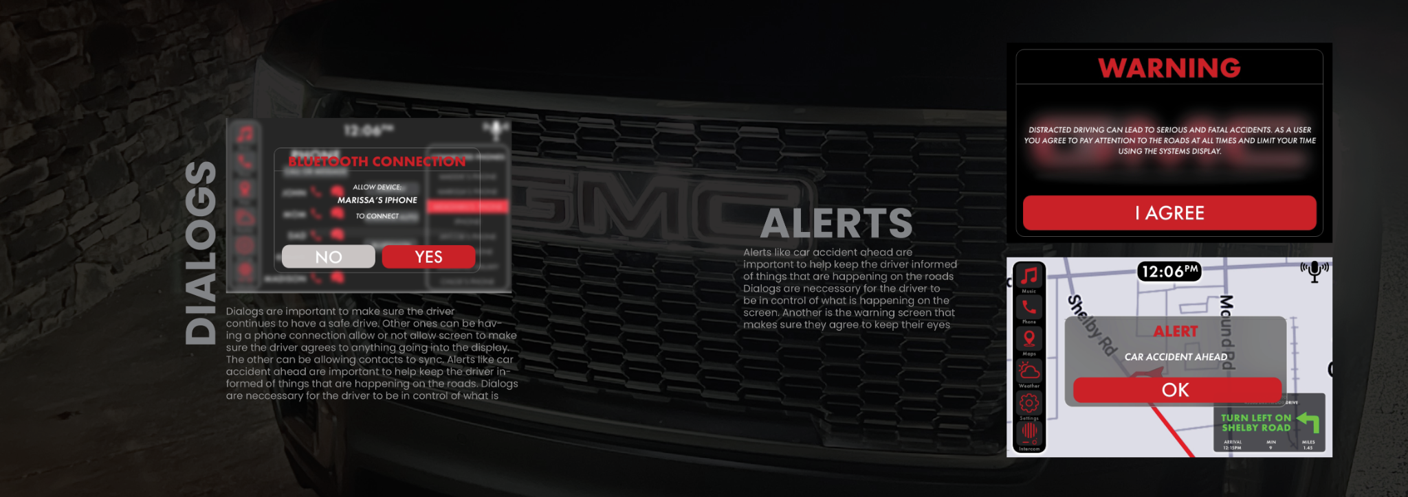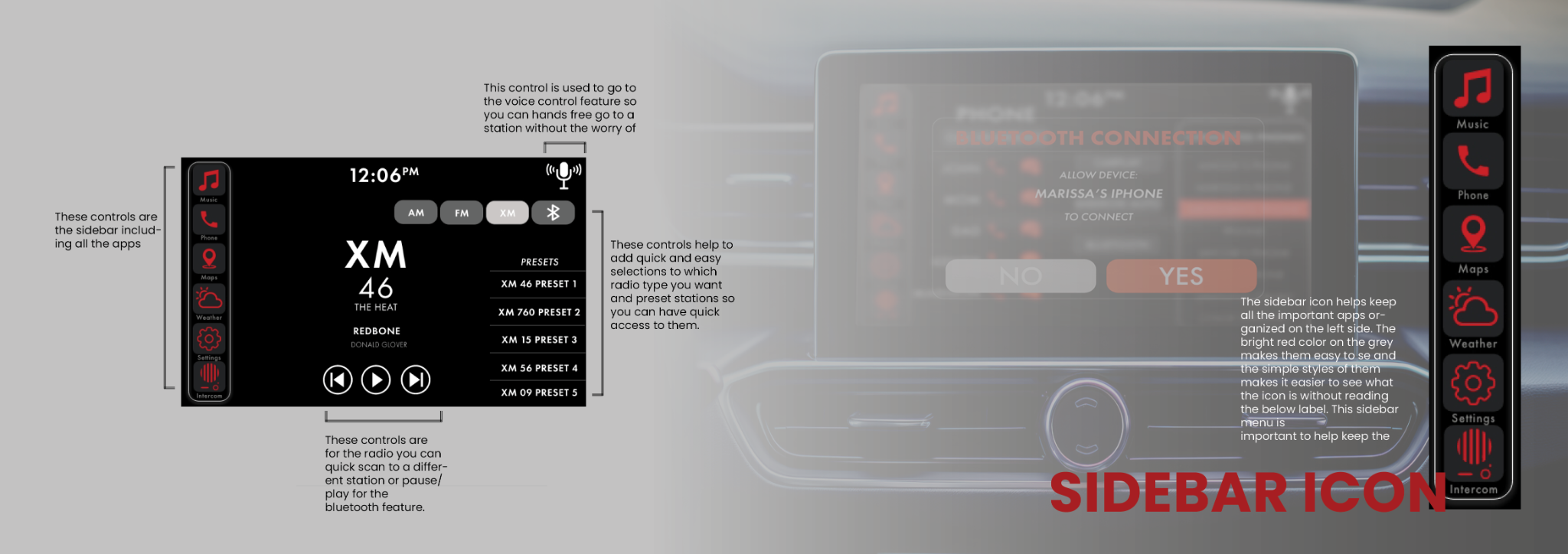 This project presents a forward-thinking approach to modern car infotainment systems. With integrated features like voice control and a more intuitive layout, including refined sidebar placement, the system is designed to deliver essential information to drivers while reducing distraction and promoting road safety. From the beginning, the primary focus has been on safety and limiting distracted driving. Interviews and usability studies show that the system is user-friendly, while also revealing several bugs and usability issues that still need to be addressed. This prototype establishes the foundation of the design, and future testing and iterations will continue to refine and improve the system.