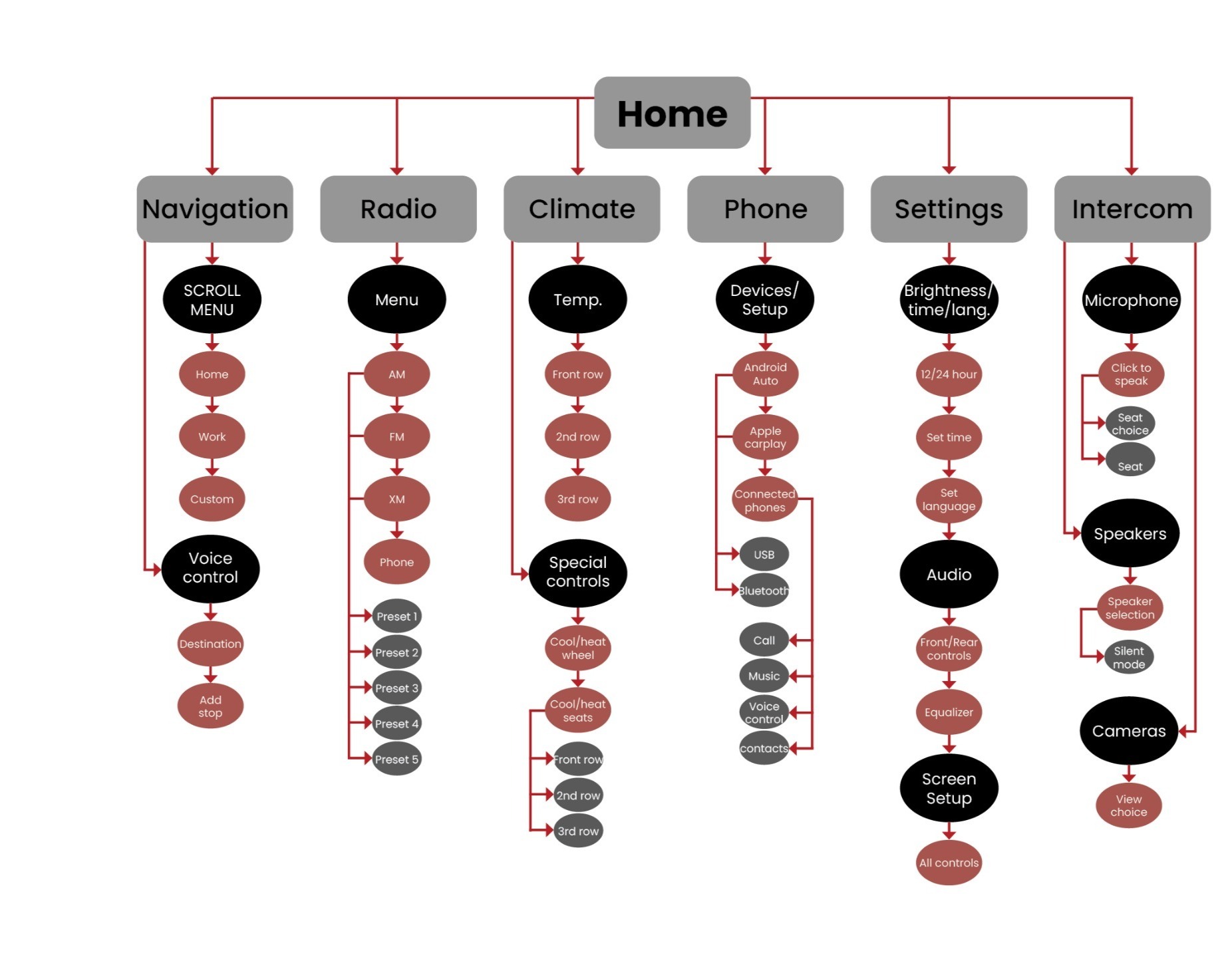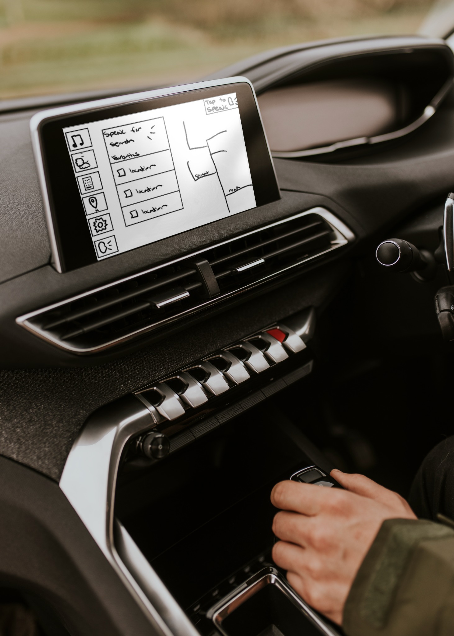 From this, I defined a primary objective: reduce eyes-off-road time and cognitive load through simpler, more standardized interactions. Secondary goals included creating patterns that could work across brands and validating the design with both younger and older drivers to ensure it’s intuitive beyond a tech-savvy audience.