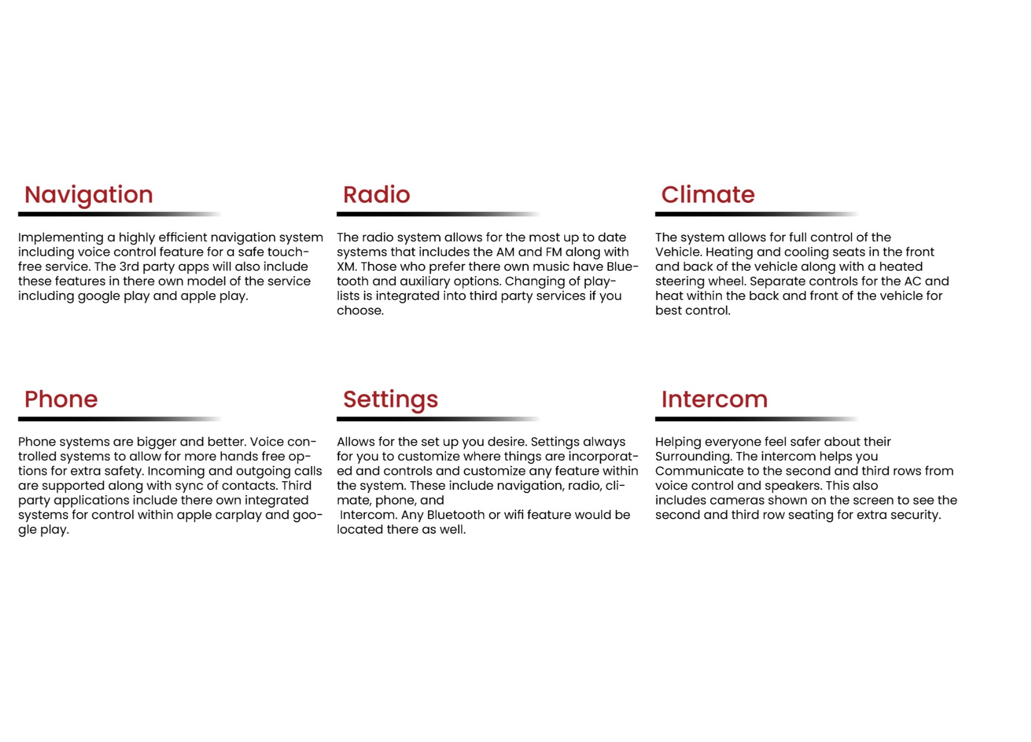 This chart highlights the core capabilities of the system, putting essential vehicle functions at the driver’s fingertips. It showcases navigation with clear turn-by-turn guidance, a full media suite (FM/AM/XM, presets, and phone audio), intuitive climate controls, and customizable settings for layout, brightness, and sound. Integrated phone features, voice controls, and an intercom with camera views and seat-by-seat audio help support safer, less distracted driving and a more comfortable experience for everyone in the vehicle.
