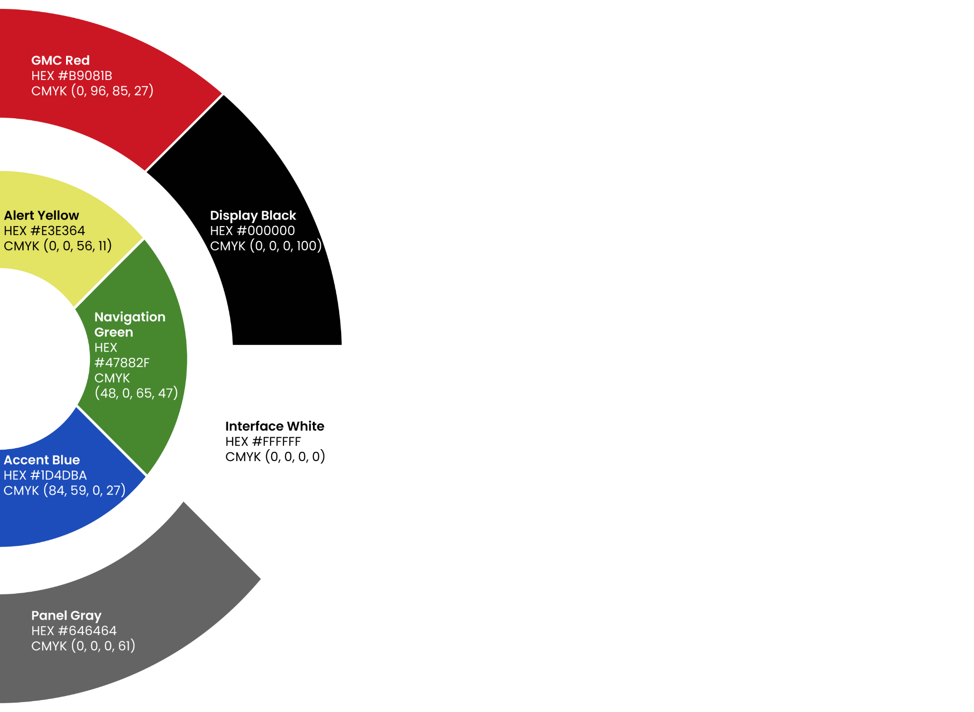 The color palette below is based on red, black, red, and grey RGB colors. The secondary colors yellow, blue, and green are used for accents to help identify logos fast in different systems, like weather, climate, and maps. The colors help create simple visuals with been regularly seen so it makes them less distracting and easier to see wherever you are. The red with the primary makes the logos pop more for quick visuals, knowing what you're clicking faster so ot limits distracted driving.