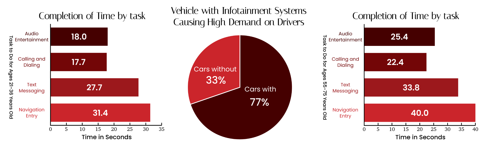 A study of modern vehicles found that 77% of cars with infotainment systems placed “high” levels of demand on drivers, compared to 33% of cars without these systems. I visualized this as a comparison chart to show how much additional cognitive load these interfaces can add.