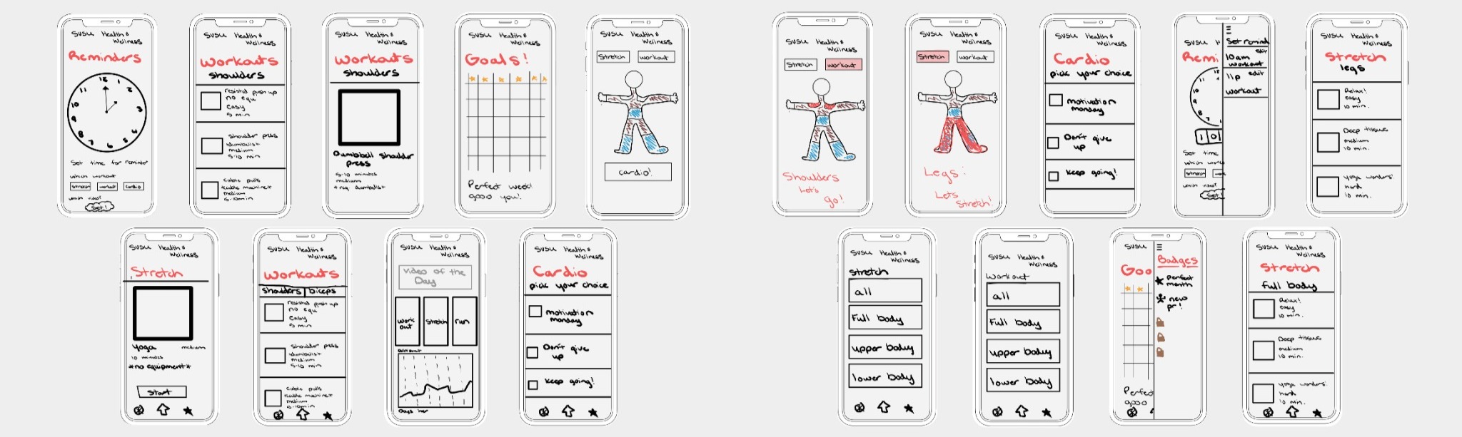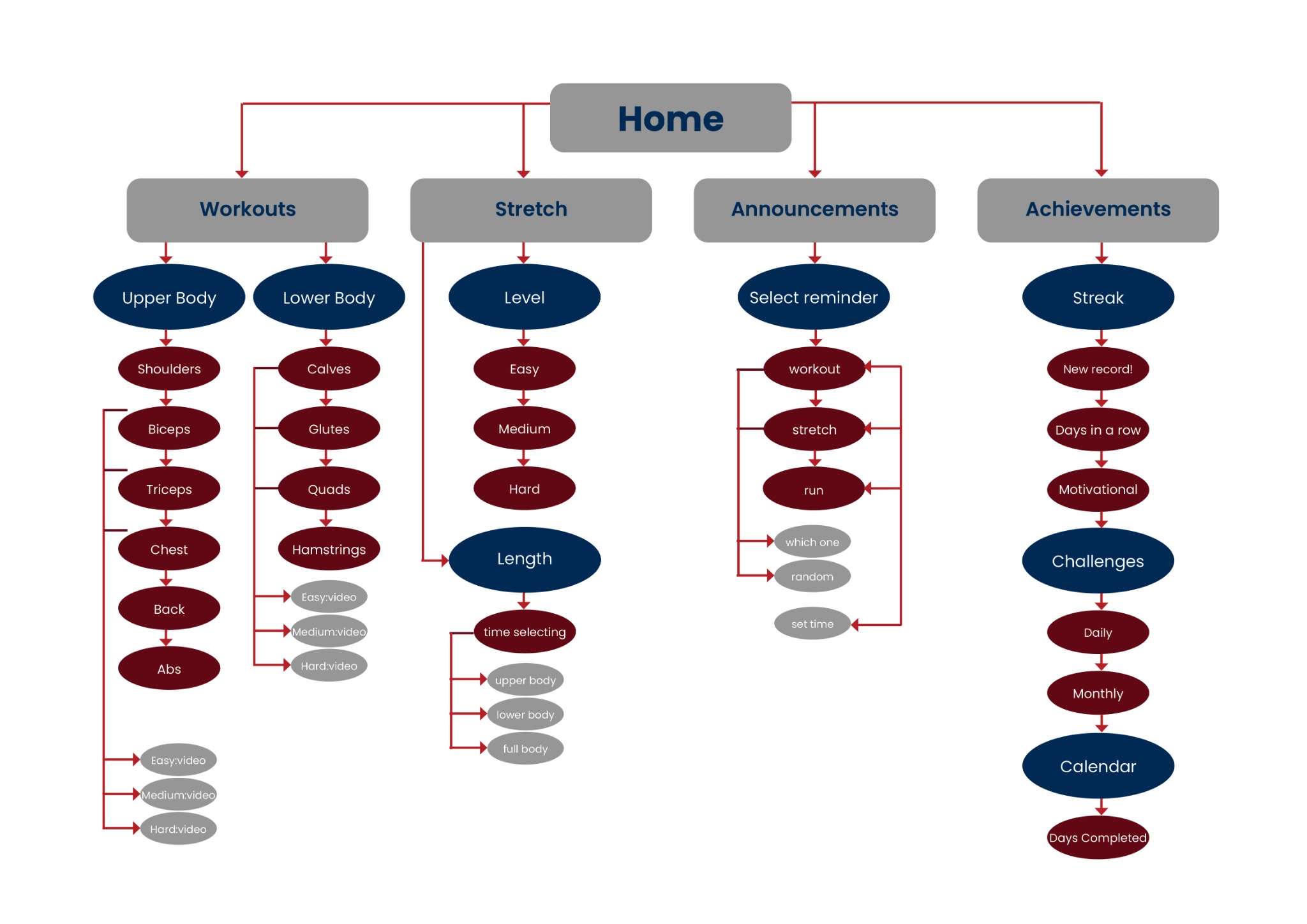 The flowchart to the right shows the way that the sections on the home with go. It shows what each category will do whether it is a workout, stretching or reminders to do either one. Making sure the layout is user-friendly and allows each switches to keep the user engage is the key.
